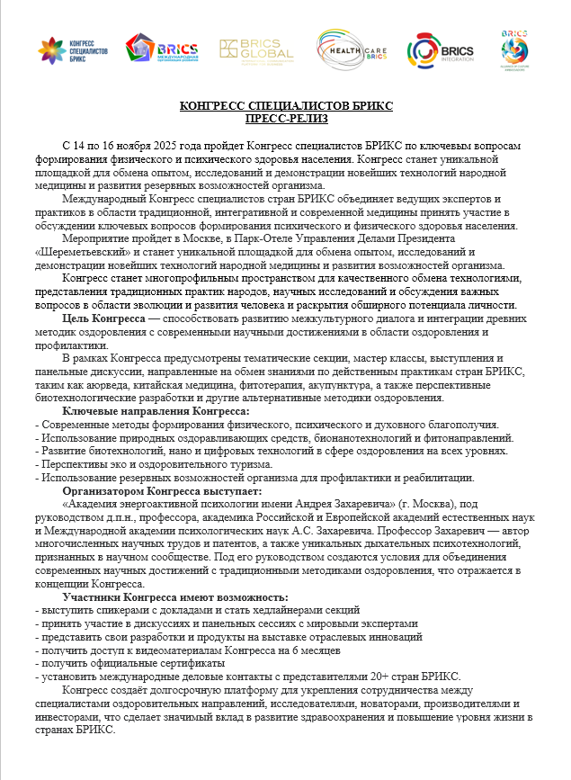 Конгресс предоставляет уникальную возможность создать сеть профессиональных связей для ученых, предпринимателей, практиков, инноваторов и специалистов стран БРИКС. Это поможет в формировании и развитии долгосрочных международных отношений и проектов, для подписания меморандума о сотрудничестве между организациями в сфере велнес индустрии, оздоровления и развития человека.