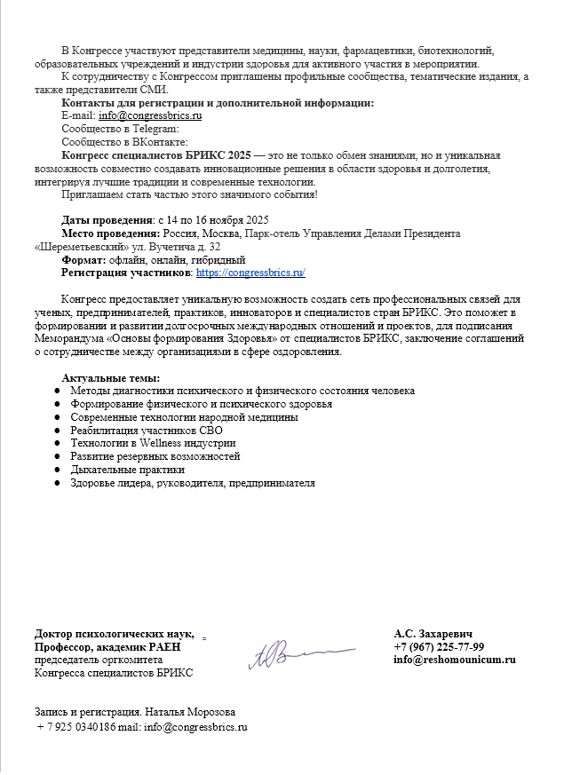 Мы уверены, что ваш вклад в подготовку и проведение конгресса будет ценным, и вы сможете поделиться своим опытом с международным сообществом практикующих специалистов в этих направлениях.